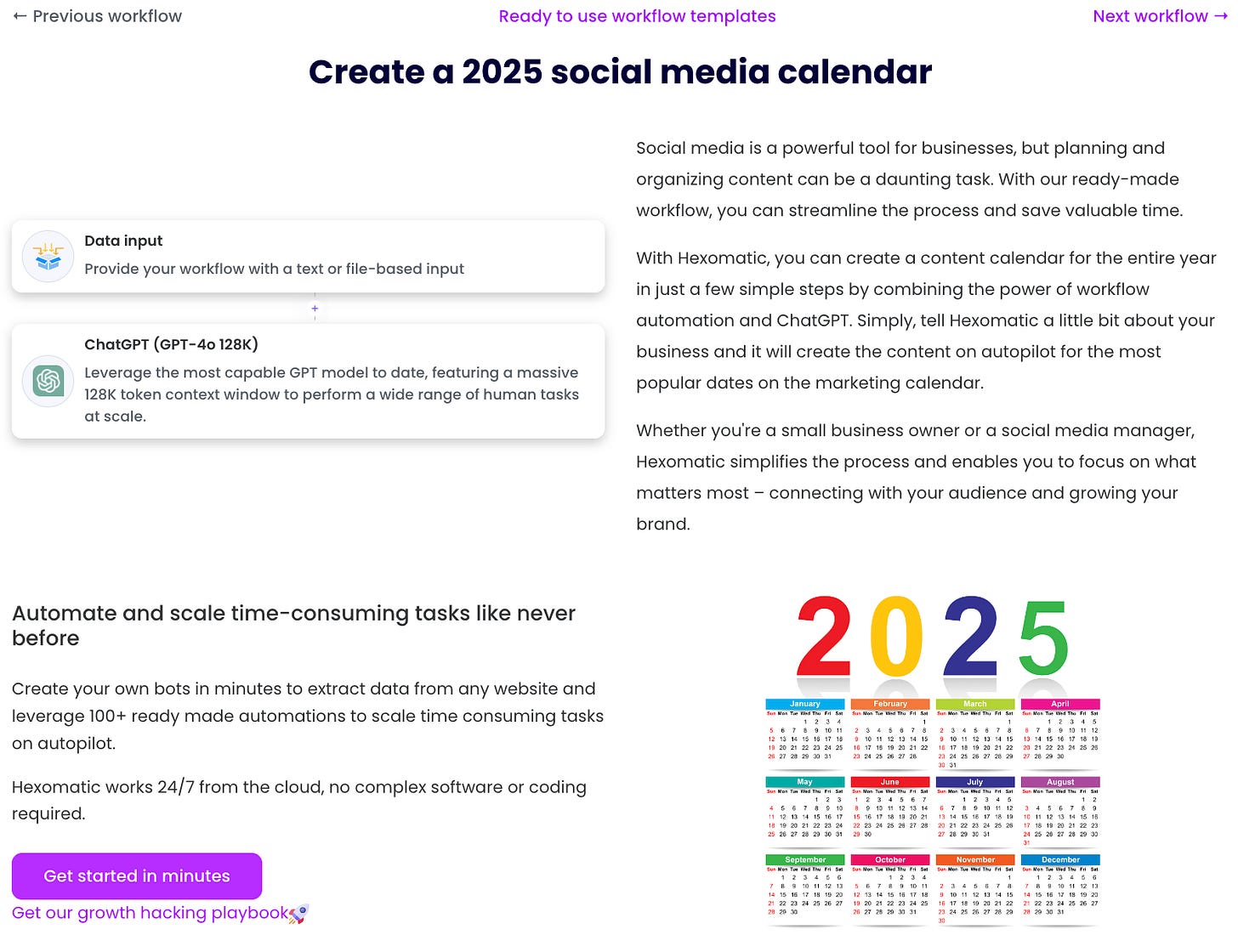 Try the template for a ready-made workflow or create your own customized approach for a truly unique content strategy! (https://hexomatic.com/ready-made-workflow-library/create-a-2025-social-media-calendar)